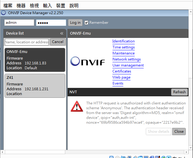 While ONVIF Device Test Tool or ONVIF Device Manager detected the LingoVM, please type user name and password to login.